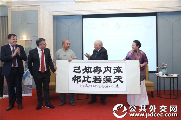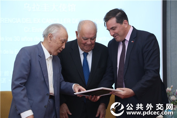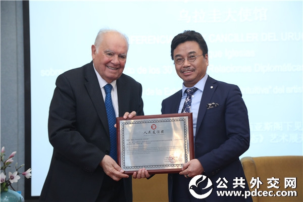 公共外交文化交流中心会长马振轩致辞,他说,今年是中乌建交30周年,在这个特别时刻,很荣幸邀请到恩里克·伊格莱西亚斯前外长阁下访华。恩里克阁下是中国人民的老朋友,也是乌拉圭资深外交官。在他的努力下,最终促成了乌拉圭与中国在1988年正式建立外交关系。马振轩说,公共外交中心同乌拉圭驻华使馆长期保持着密切联系,在费尔南多•卢格里斯大使阁下支持下,中心和使馆共同举办了“走近东角城”拉美加勒比经贸推介会,接待了乌拉圭旅游部副部长本杰明·利维罗夫先生,接待了乌拉圭教育与文化部长玛丽亚·胡里娅·穆尼奥斯女士。他很高兴今天能够再次迎接来自遥远大洋彼岸的乌拉圭的朋友。马振轩随后向恩里克·伊格莱西亚斯前外长颁发“人民友谊奖”证书,感谢其为发展中乌友好作出的卓越贡献和对公共外交事业的鼎力支持。