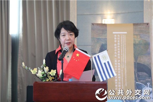 外交人员服务局常务副局长蒋琪致辞,欢迎恩里克·伊格莱西亚斯前外长一行访华,蒋琪常务副局长介绍了外交人员服务局同乌拉圭驻华使馆长期的友好合作,并介绍了服务局今后的主要工作计划,包括创办齐家园外交使团文化交流中心、创建艺术创作基金会、建立国际艺术联盟等,为更好服务包括乌拉圭驻华使馆在内的广大驻华外交使团。