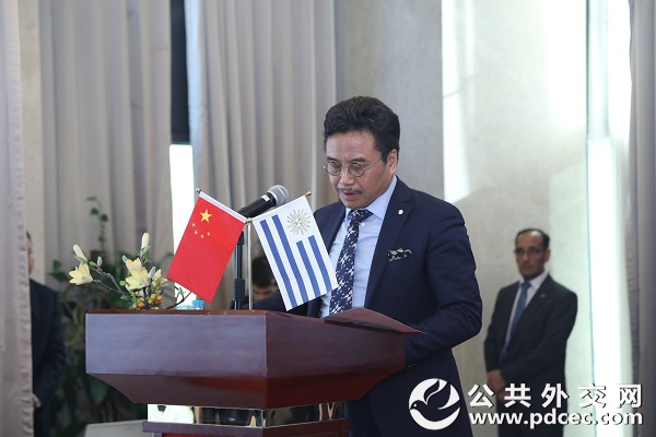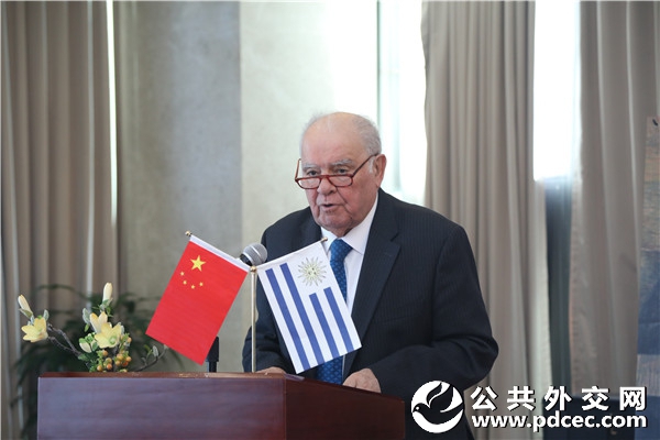 乌拉圭前外长恩里克·伊格莱西亚斯致辞,表示很高兴在这个特殊的时刻再次访华。他回顾了上世纪70年代以来多次访华的经历,特别是1985年担任乌拉圭外长后,开始同中国进行对话,并最终促成了1988年2月2日乌中正式建交。他说,建交以来,两国高层交往不断,各领域合作密切展开。目前,乌拉圭对外出口的30%在中国,中国已成为乌第一大贸易伙伴。两国在社会文化方面也进行了卓有成效的合作,两国的友谊越发巩固。乌拉圭愿积极同中国探讨签定自由贸易协定,可以是两国的双边协议,也可以是在南方共同市场框架下的多变协议。在两国发展新阶段,双方可以在贸易、投资、服务、旅游等领域展开合作。乌拉圭高度赞赏中国在消除贫困领域做出的历史性贡献;高度赞扬中国在世界经济起到的稳定重要,特别在全球经济衰退时期,中国保持了经济向好势头,带动了世界经济的发展,避免了全球经济的进一步恶化;中国还为多边主义和贸易开放作出的贡献,乌拉圭赞同APEC利马峰会期间,中方支持自由贸易的立场。